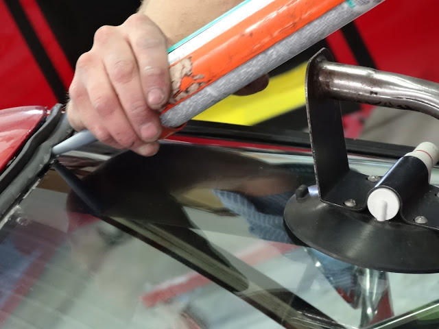 Once seated in the gasket all the way around the windshield, place a urethane sealant in the gasket, immediately removing any excess