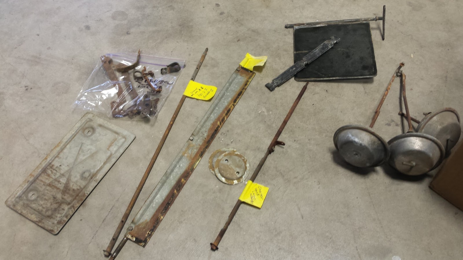 Rods, flaps and linkage system are disassembled and ready for cleaning and paint. We'll use steel wool on the vacuum parts and rods, linkage and small hardware will be placed in parts cleaner. We were missing some of the old old hardware and had to replace it. The hardware kit from Classic Industries does NOT include many of the harder to find nuts, springs or cotter pins. 1 cotter pin came with the seal kit from Detroit Muscle Technologies