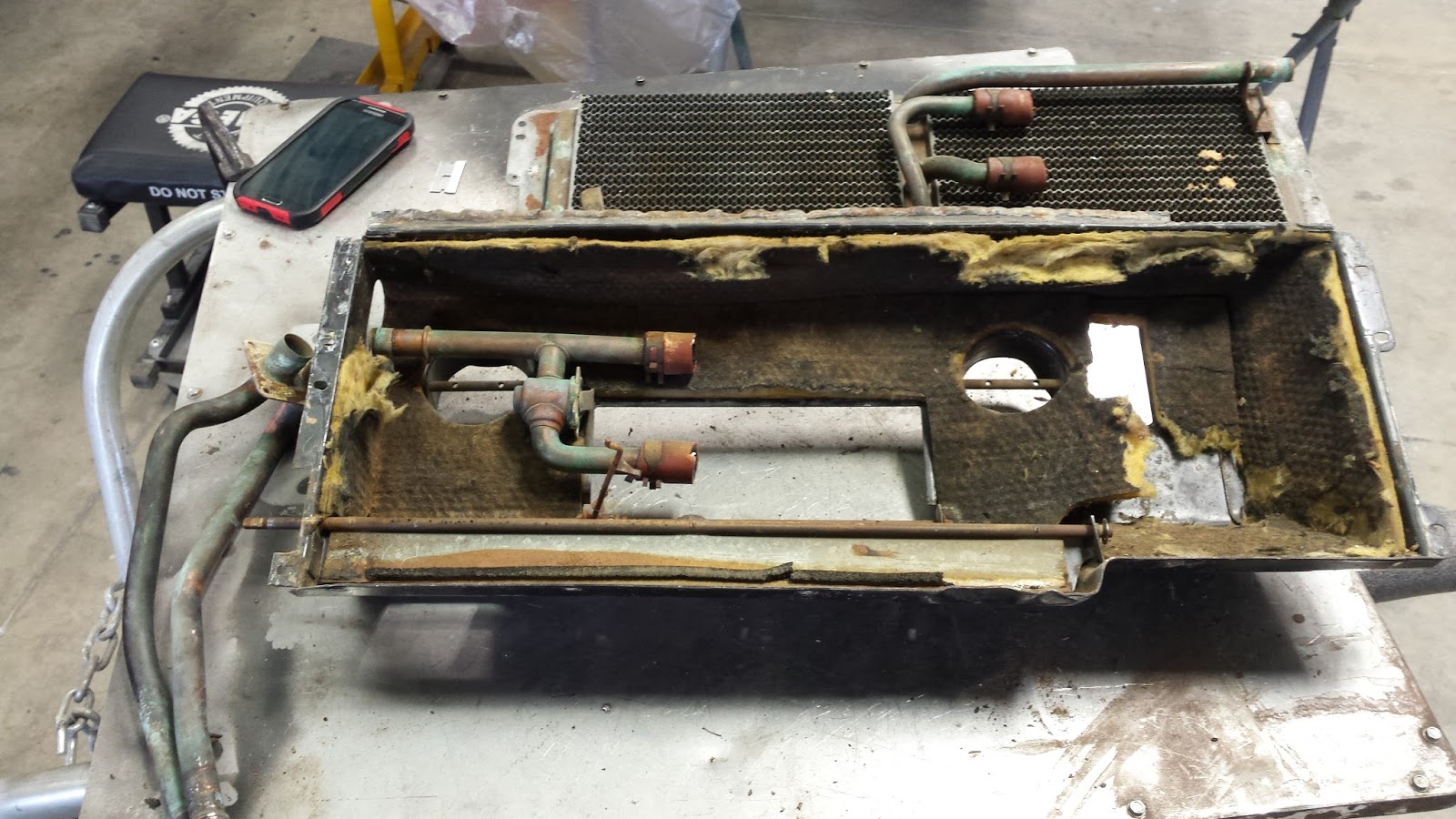 The heater box is apart with the heater core on the left and the A/C condenser on the right. Both items will be replaced. most of the seals are already falling off or missing from the inside of this box and the rodents were making large nests in the insulation
