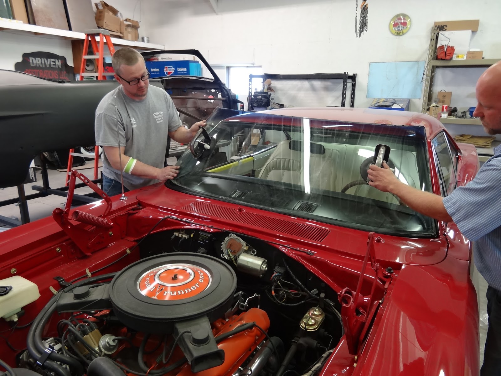 In our example, this 1970 Plymouth Road Runner was receiving a complete paint job with interior and exterior color change. To paint a car properly, the windshield must be removed.